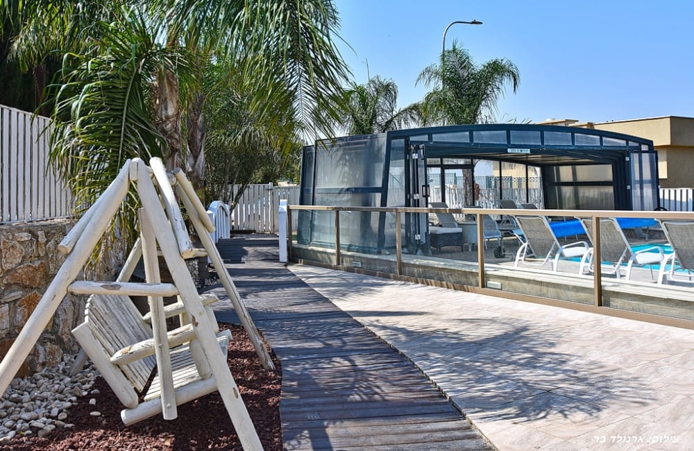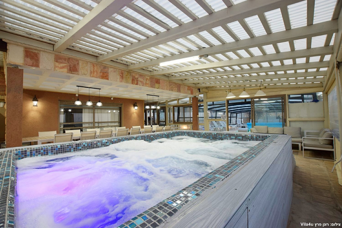 בריכת שחייה בנויה (מחוממת ומקורה בחורף), ג'קוזי ספא, פינת ברביקיו הכוללת משטח עבודה ומטבח חיצוני מאבזר, שולחן סנוקר, שולחן פינג פונג וריהוט גן יוקרתי עם שלל פינות ישיבה מוצלות, צמחייה מטופחת ותאורה לעת ערב.