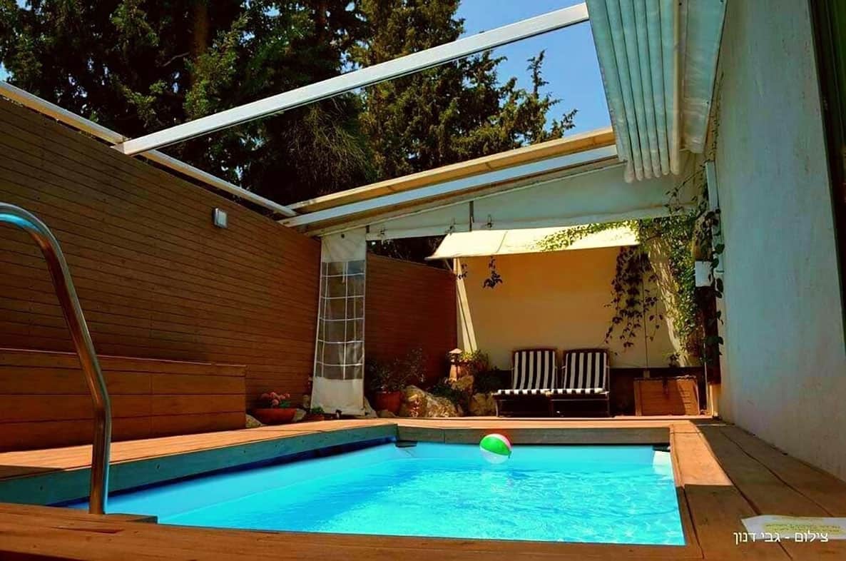 מעל הבריכה המחוממת סוכך חשמלי נפתח ונסגר, המאפשר גם בחורף מסיבות בריכה קסומות עם בידוד מושלם.
