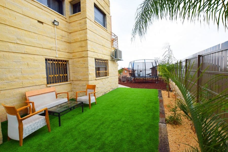 טרמפולינה גדולה, שולחן כדורגל, בריכה, פינת ברביקיו, ריהוט גן.